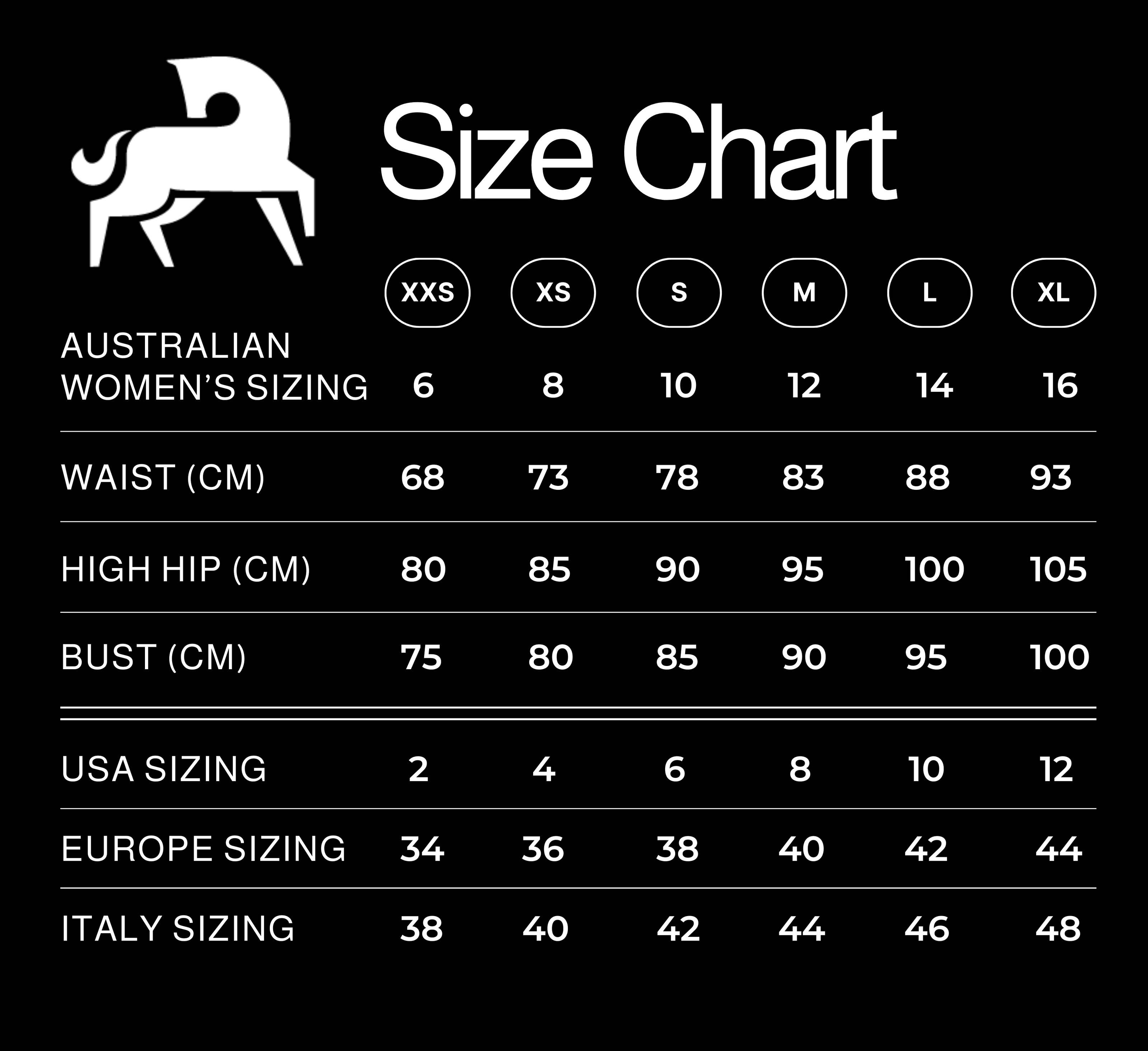 Our apparel is designed to fit a wide range of real bodies and sizes. Our riding bottoms run slightly more generous than standard Australian sizing. If you are in between sizes or prefer a firmer fit, we recommend sizing down.